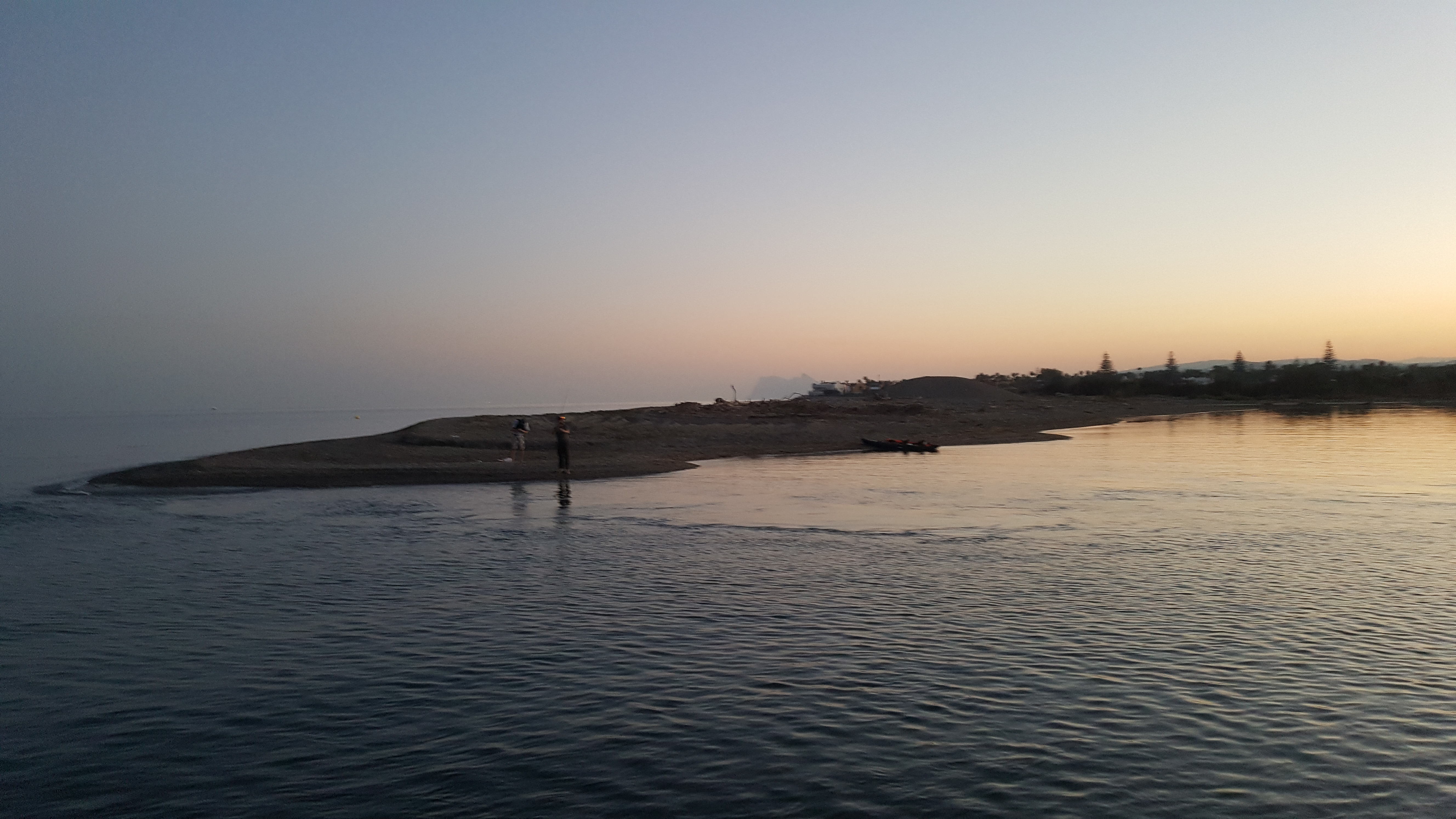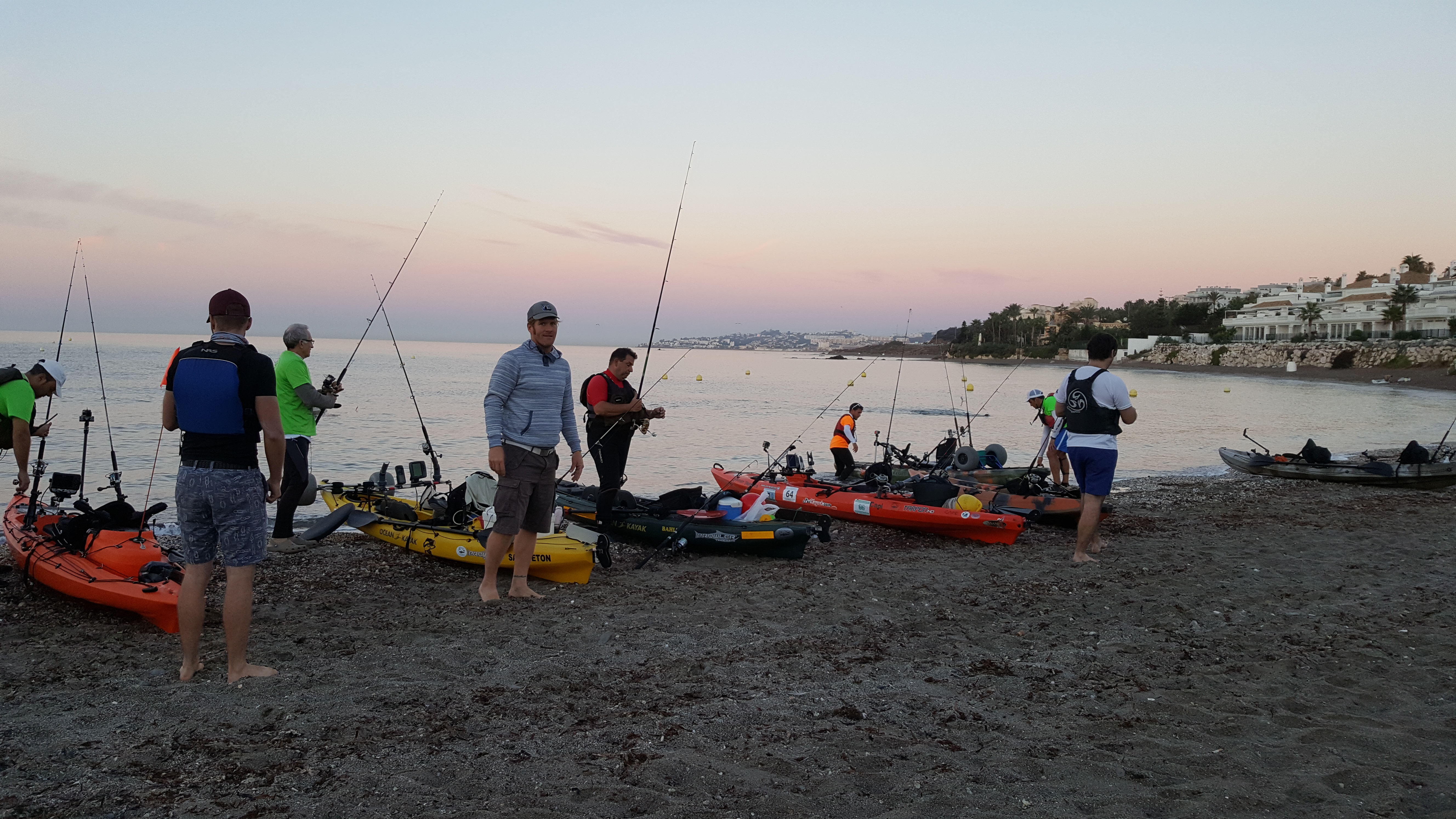 Wir trafen uns mit Victor, Hubertus und dem Peskayak-Team an einem Strand von Fuengirola vor Sonnenaufgang um 6 Uhr morgens!! Wir hatten nur wenige Minuten Zeit, das Angel-Equipment vorzubereiten, die Angelkajaks auf die Kajakwagen zu laden und den Sonnenaufgang am Strand zu genießen. Ein wunderschöner Tag brach an und kein bisschen Wind! Fische aufgepasst, wir kommen!
