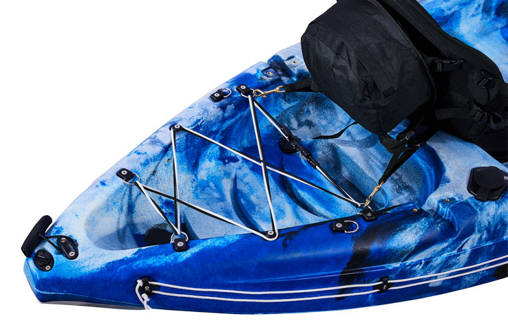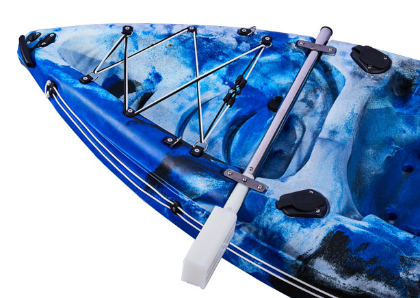 4 bereits im Kajak integrierte Rutenhalter: zwei vorne und zwei hinten. Diese können zum Beispiel beim Schleppen, für den Transport eines Keschers oder auch als als Rutenhalter für die Ersatzruten auf dem Kajak genutzt werden.