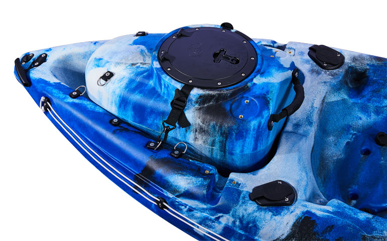 Die vordere Stauluke bietet Zugriff auf den Rumpf, um nicht verwendetes zusätzliches Material aufzubewahren. Ebenso wie der hintere Aufbewahrungsbereich, in dem Ausrüstung dank zahlreicher farbiger Gummiseile noch sicherer ist. Die mittlere Luke hebt das Cruz Pro Angler von der Konkurrenz ab, denn es verfügt über eine Tacklebox für Köder, Haken, Bleie und andere kleinere Ausrüstungsgegenstände sowie einen für Würmer oder lebende Köder darunter (sofern es die Gesetzeslage erlaubt).