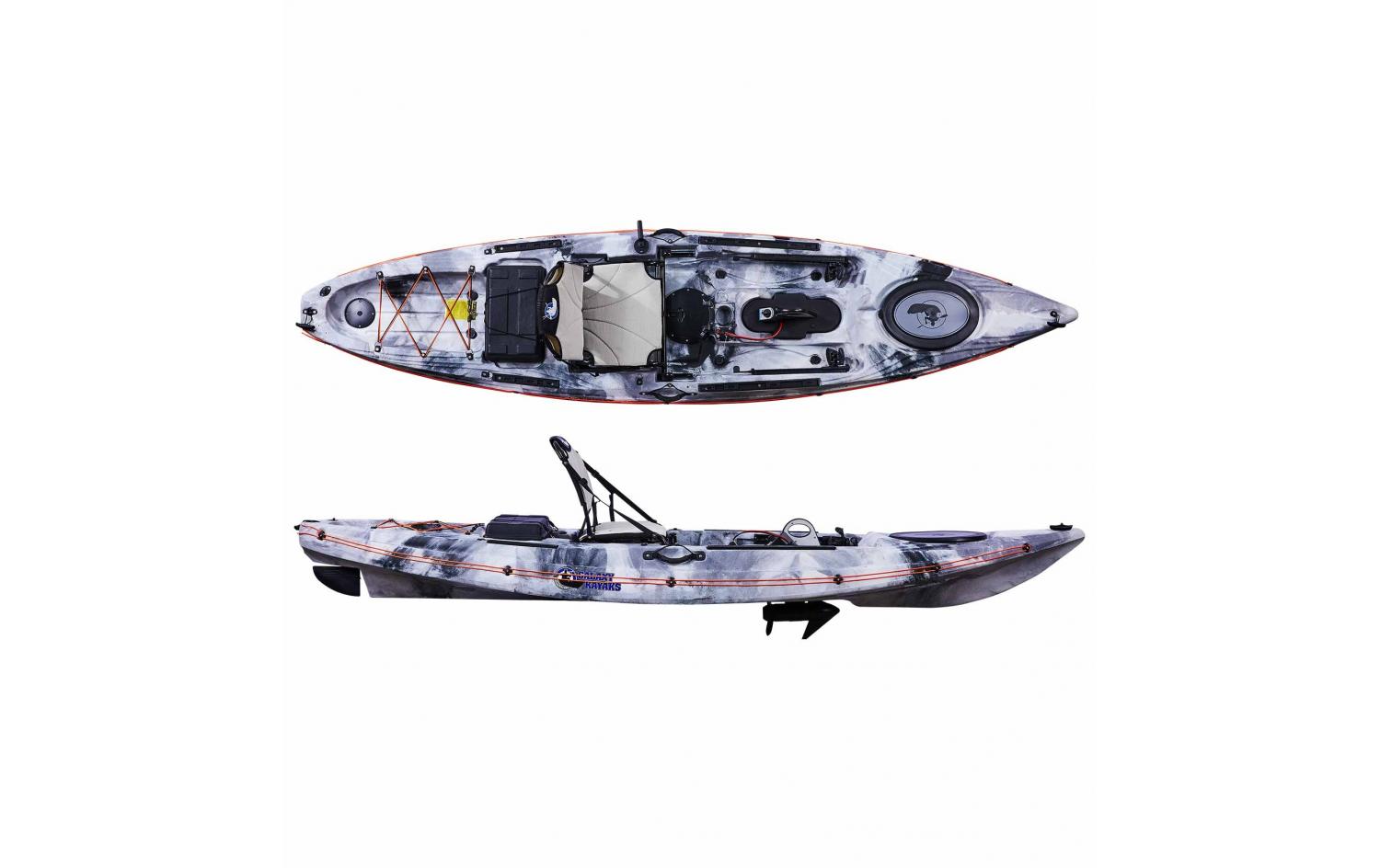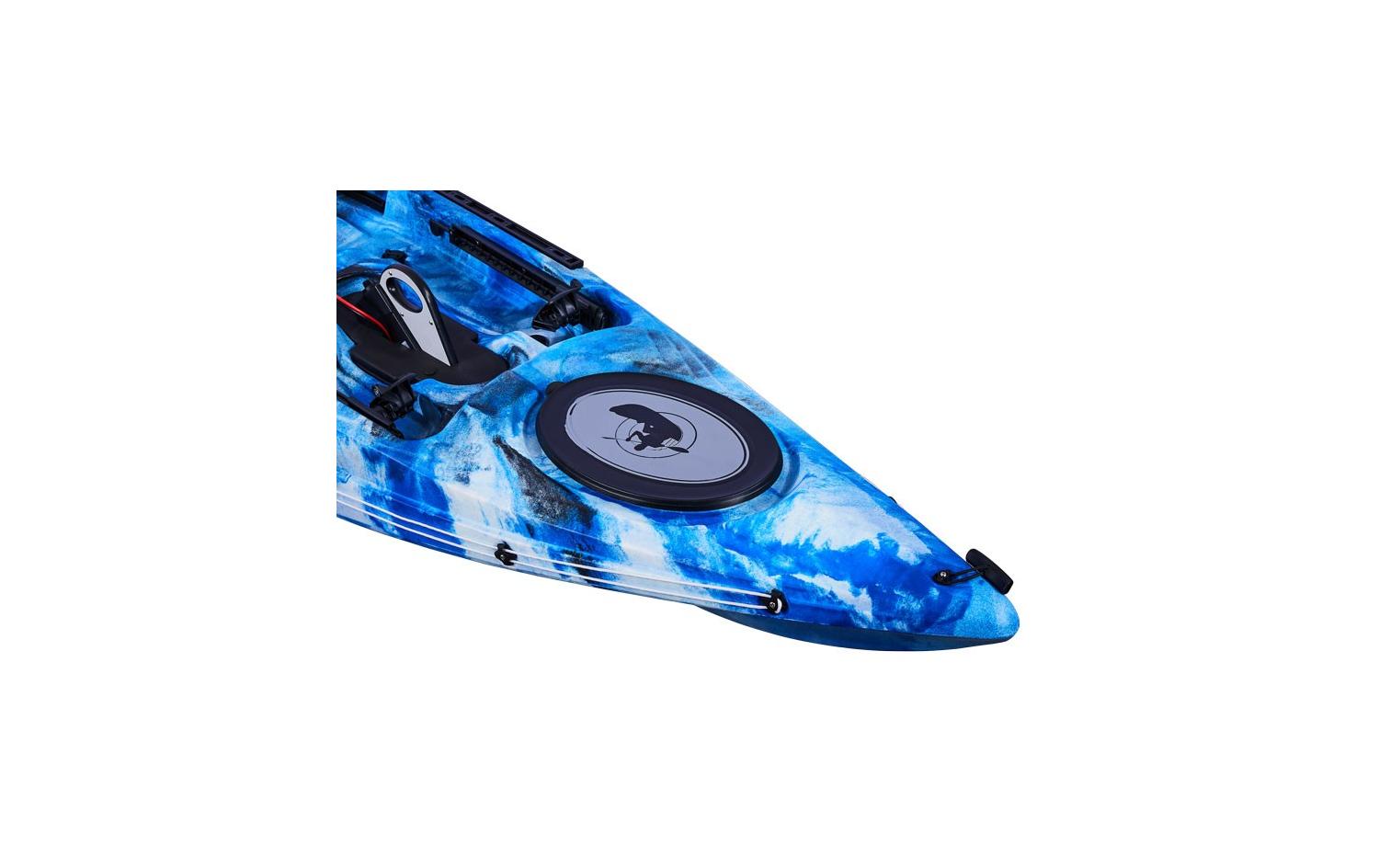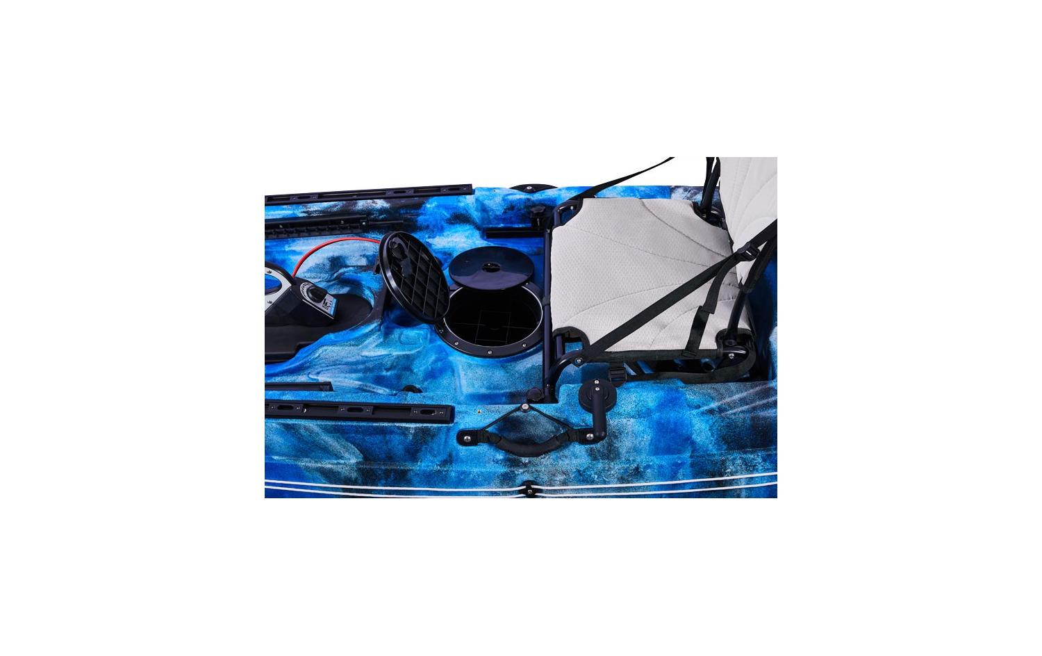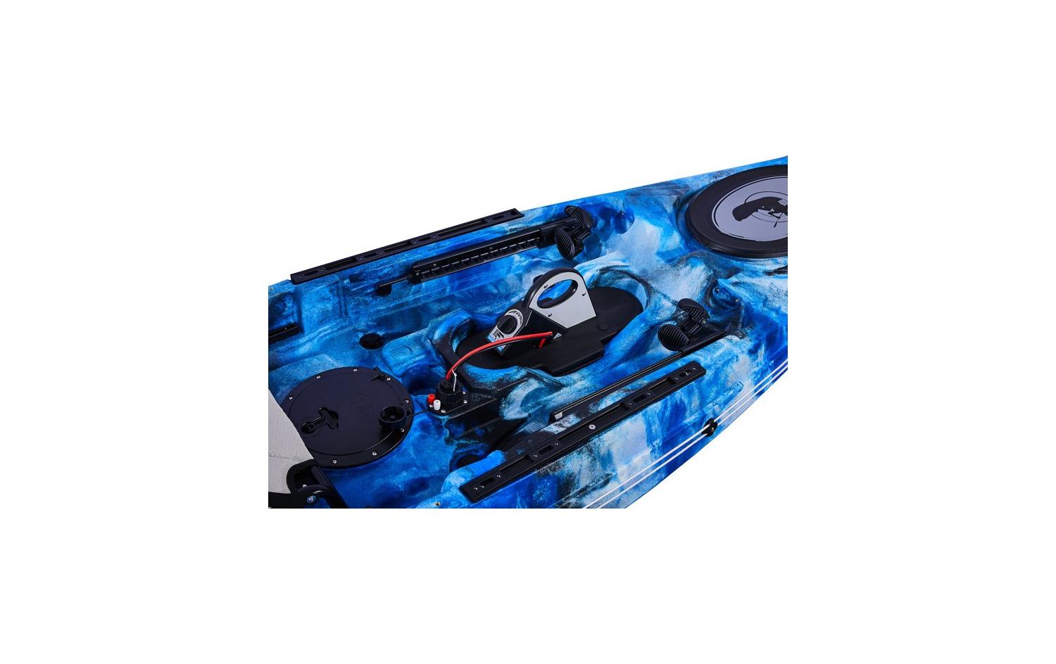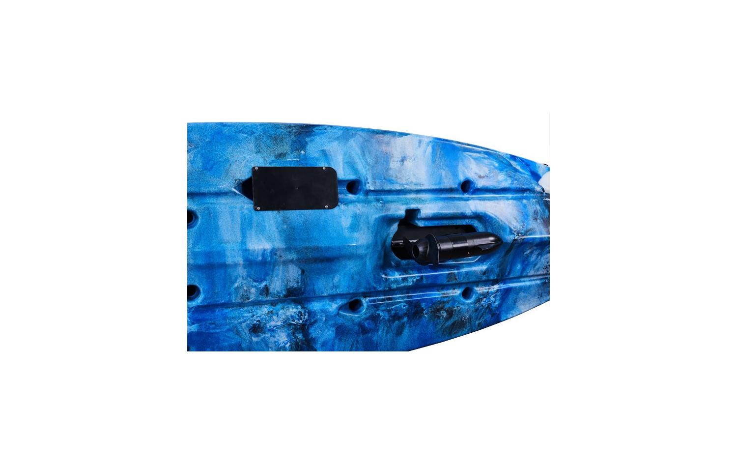 Zusätzlich verfügt dieses Kajak über einen elektrischen Anschluss, der sich in der Nähe der mittleren Luke befindet. Die spezielle wasserdichte „Steckdose“ ermöglicht es Ihnen, den Motor zu sichern und schnell an die Stromquelle anzuschließen. Der Anschluss hat eine vorgefertigte Verkabelung zum Batteriefach, welches sich direkt hinter dem Sitz befindet.