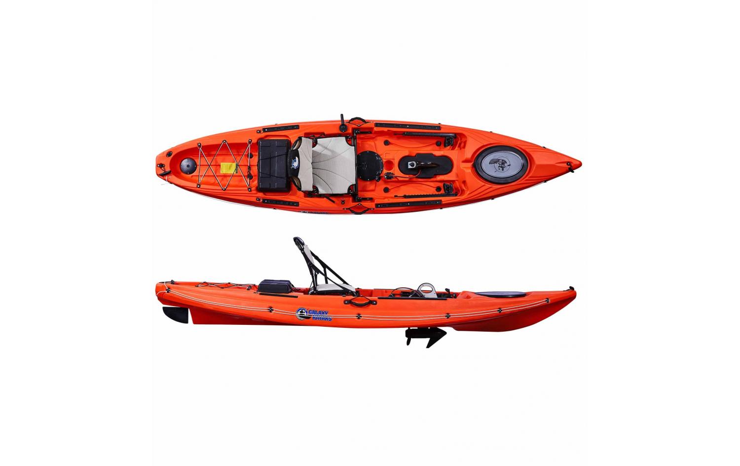 Im Gegensatz zu unseren anderen Modellen, an denen ein externer Motor angeschlossen werden kann, integriert das Galaxy Wahoo S den Motor oder den Pedalantrieb in ein dafür vorgesehenes Fach, welches sich mittig im Kajak befindet.