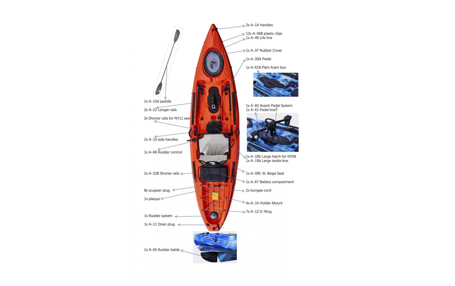 Länge: 357 cm | Breite: 84 cm | Höhe: 38 cm | Material: UV-beständig, hochwertiges LLDPE | Gewicht: 38,5 kg | Maximale Ladekapazität: 180 kg | Übersetzung des Propellers = 1:10 | Größe des Propellers = 31cm | Größe der Pedale= 16,5 cm | Material = seewasserbeständiges Aluminium | Gewicht = 7,8 kg | Höhe 77 cm, Breite 31,5 cm