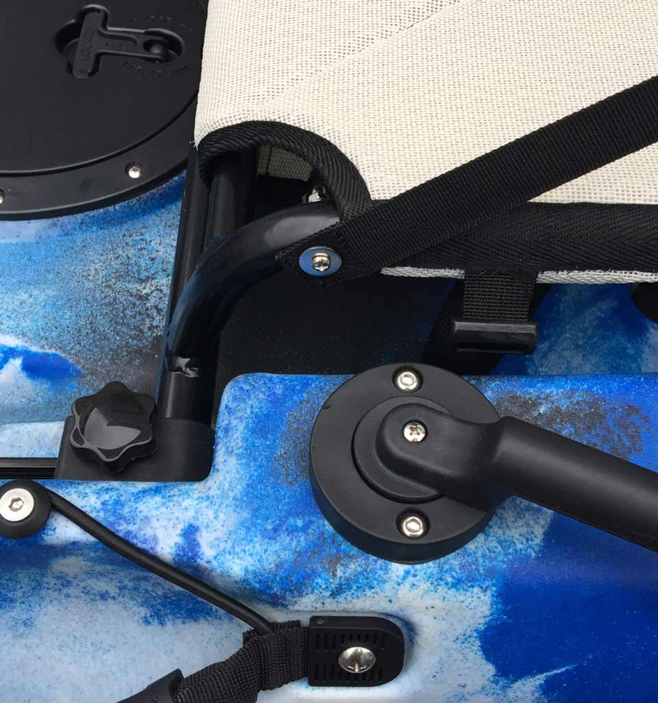 Der Vista Sitz für das Wahoo von Galaxy Kayaks ist in Zusammenarbeit mit Kayakfahrer entwickelt worden. Dieser Sitz ist die Standardausrüstung für das Wahoo Angelkajak. Das Hautmerkmal dieses Sitzes sind die zwei horizontalen Rahmenteile, die perfekt in die Form des Wahoo passen und den Sitz sicher in Position halten. Der Sitz wird im fordern Bereich mit Kajak verschraubt und lässt sich so auf die richtige Entfernung zum Antrieb einstellen.