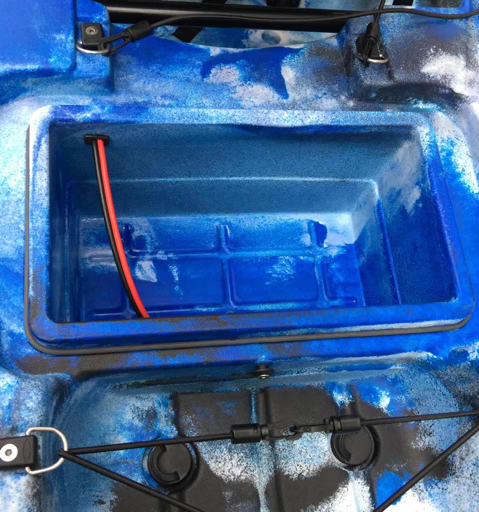 1 spezielles Batteriefach: direkt hinter dem Kajaksitz. Dieses Fach hat bereits eine Verkabelung zum neuen Elektroanschluss verlegt.