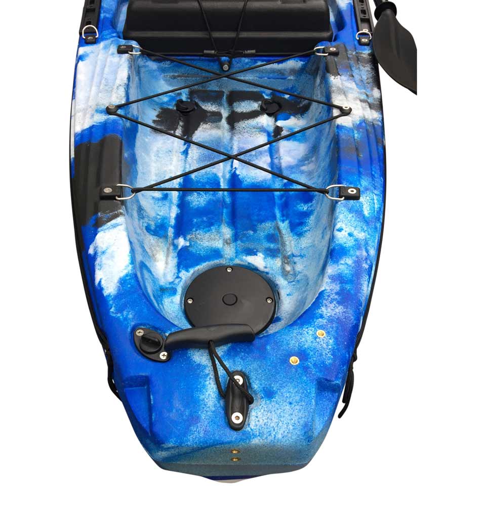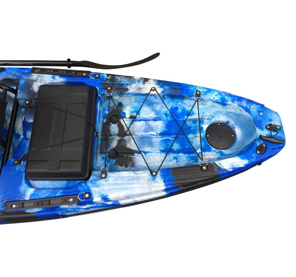 1 hinterer Aufbewahrungsbereich: komplett mit Gummizügen, dieses Fach ermöglicht es simpel Sachen auf dem Kajak zu transportieren.