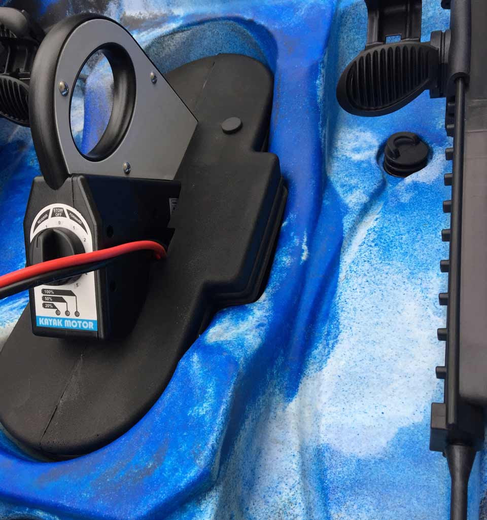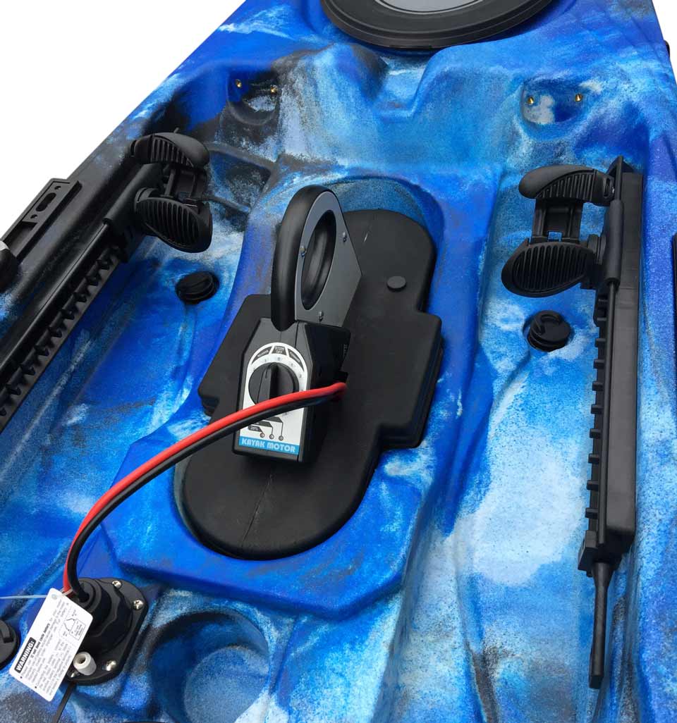 Zusätzlich verfügt dieses Kajak über einen elektrischen Anschluss, der sich in der Nähe der mittleren Luke befindet. Die spezielle wasserdichte „Steckdose“ ermöglicht es Ihnen, den Motor zu sichern und schnell an die Stromquelle anzuschließen. Der Anschluss hat eine vorgefertigte Verkabelung zum Batteriefach, welches sich direkt hinter dem Sitz befindet.