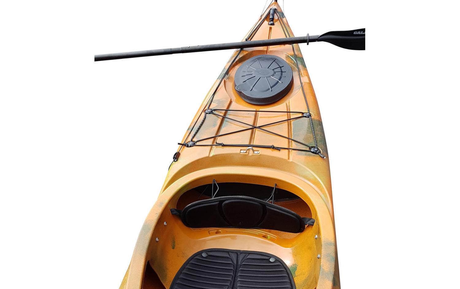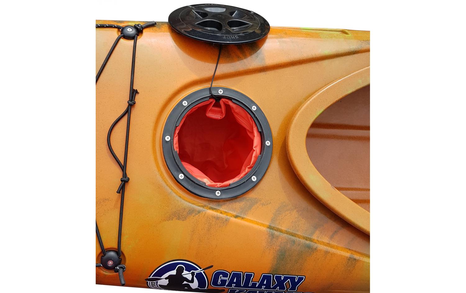 Das Galaxy Eskimo Reisekajak ist beladen mit weiteren standardmäßig eingebauten Extras; dazu gehören: zwei Luken mit Gummidichtung um Dinge zu lagern, eine Twist-Lock Luke mit einer spritzwasserdichten Tasche, Rettungsleine und elastische Gummiseile und Deckbälle und Haltegriffe an beiden Enden, damit Sie ihr Kajak sicher am Land transportieren können. Das Eskimo bietet als zusätzliches Accessoire außerdem die Möglichkeit, ein Maschennetz anzuhängen, um an Bord noch mehr lagern zu können.