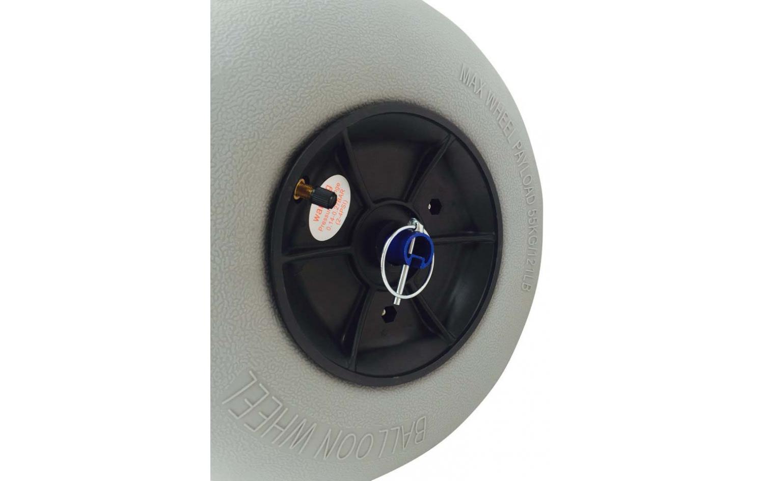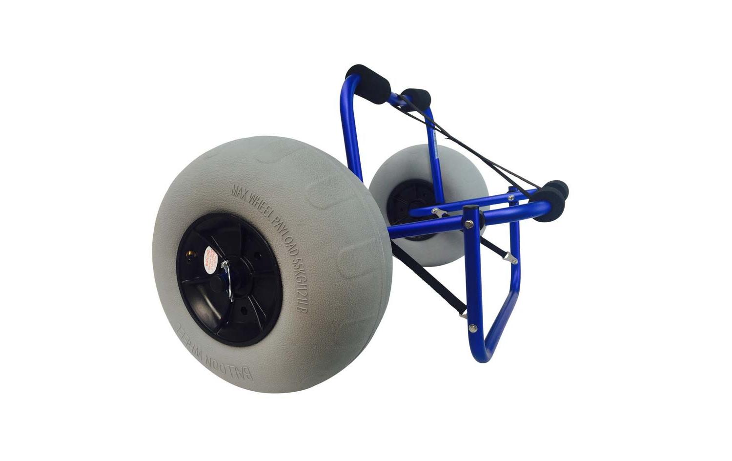 Die aufblasbaren Räder sind aus robustem Gummi und können ein Gewicht von bis zu 55kg auf jedem Rad tragen. Die Räder sollten mit BEI 0,4 PSI für eine maximale Lebensdauer gefüllt werden. Der Rahmen des Rollwagens ist aus einem ionisierten metallischen blauen Aluminium, dies macht ihn leicht und attraktiv.