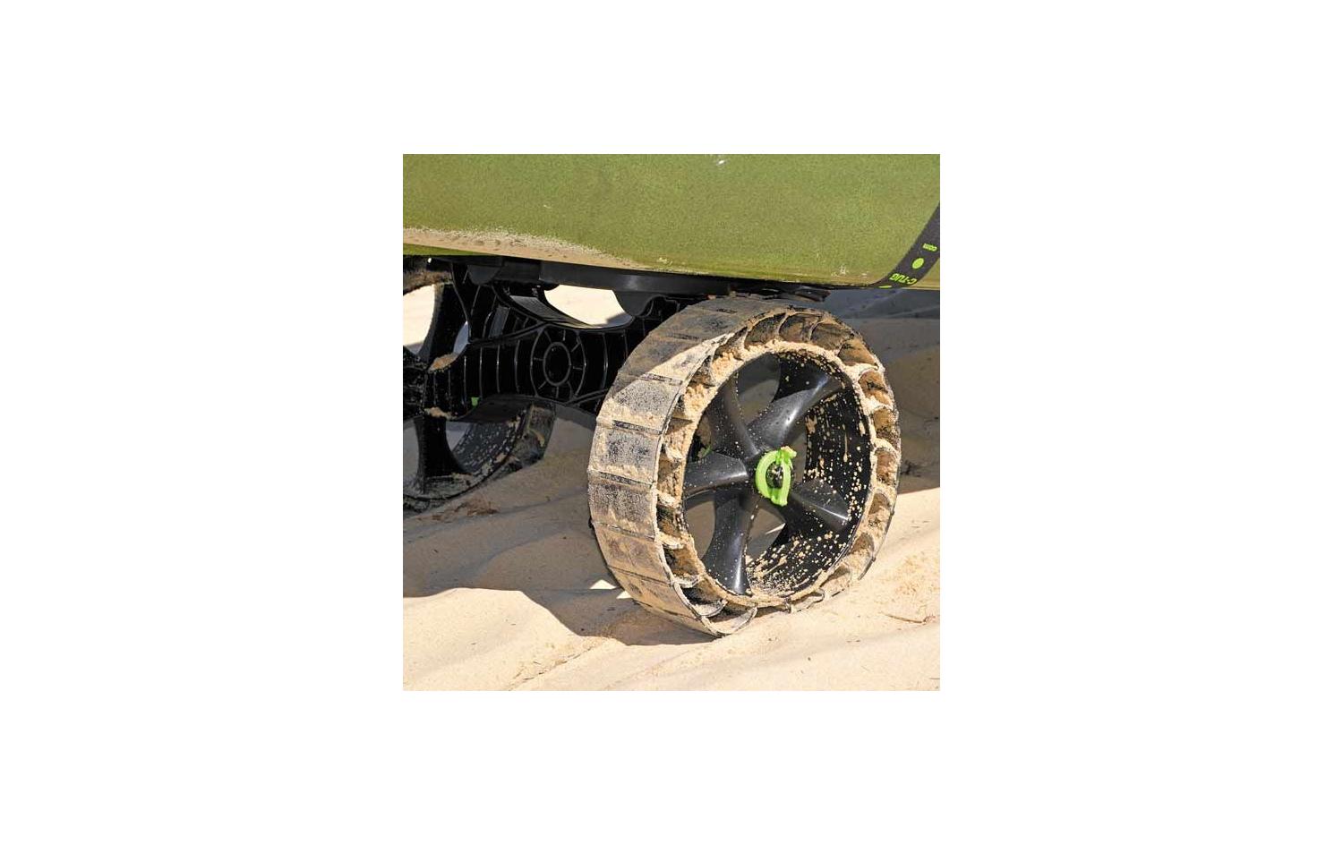 SandTrakz-Pannenfrei Räder ahmen dieses Raupensystem nach, die äußere Felge wird bei Verwendung zusammengedrückt, wodurch sich eine längere Raupenlänge ergibt. Auf weichem Sand reduziert dies die Zugkraft Ihres Wagens um mehr als die Hälfte im Vergleich zu standardmäßigen pannensicheren Kiwi-Rädern *! Tatsächlich ist das SandTrakz-System so effektiv, dass wir es für besser halten als Ballonräder!